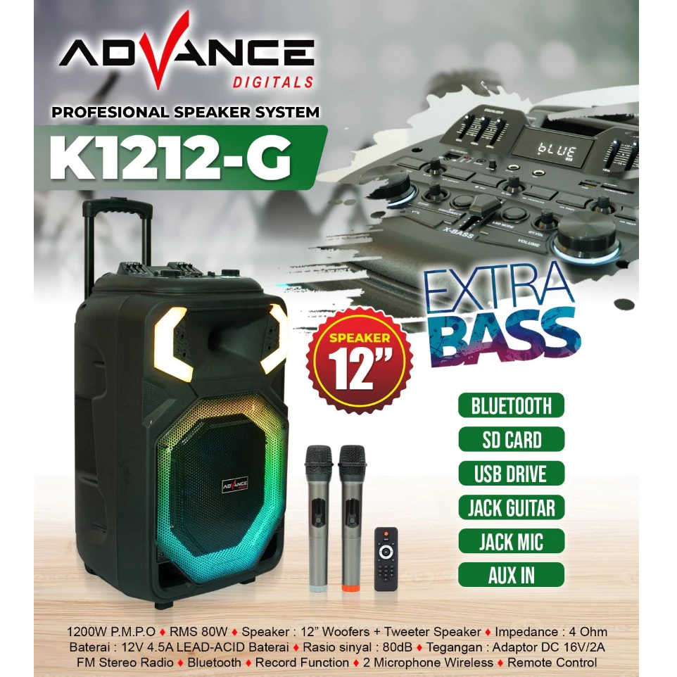 Advance K1212G Speaker Bluetooth Portable 12 inch Extra Bass GRATIS 2 Mic Wireless Garansi 1 Tahun