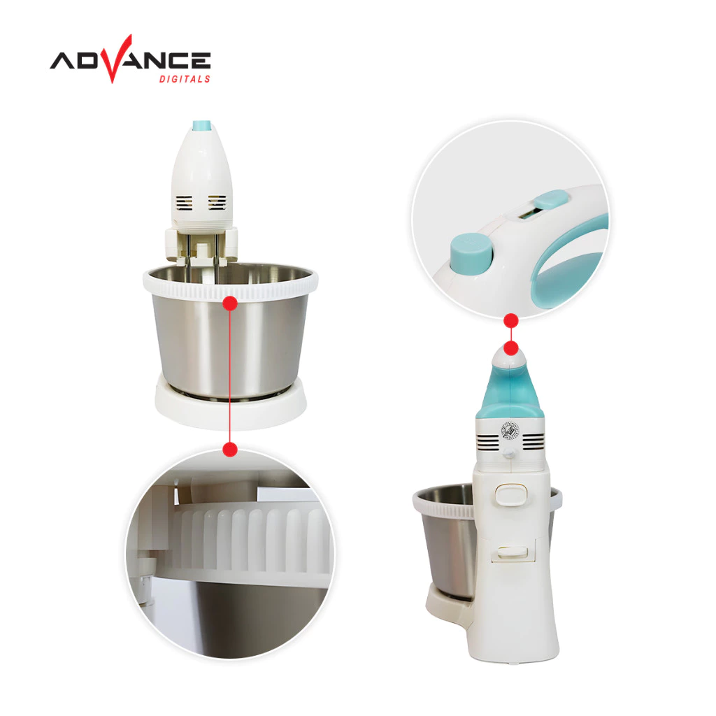 Advance MX-333 stand mixer yang bisa menjadi hand mixer karna mesin motor bisa dilepas pasang dengan daya 200 Watt. Advance MX-333 berkapasitas 2 Liter dan sudah dilengkapi dengan 2 pengocok dan 2 pengaduk. Advance MX-333 sudah terdapat 5 Level Speed kecepatan yang bisa kami sesuaikan dan mangkok stainless bisa berputar sehingga membuat adonan tercampur dengan merata. Keunggulan dari Advance MX-333 ini juga memiliki Low Noise Sound alias tidak berisik saat motor mesin menyala.