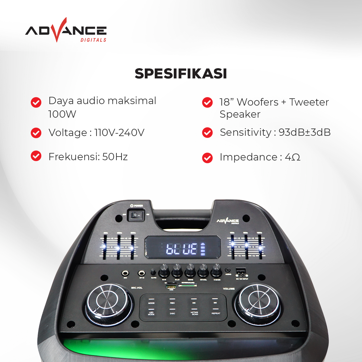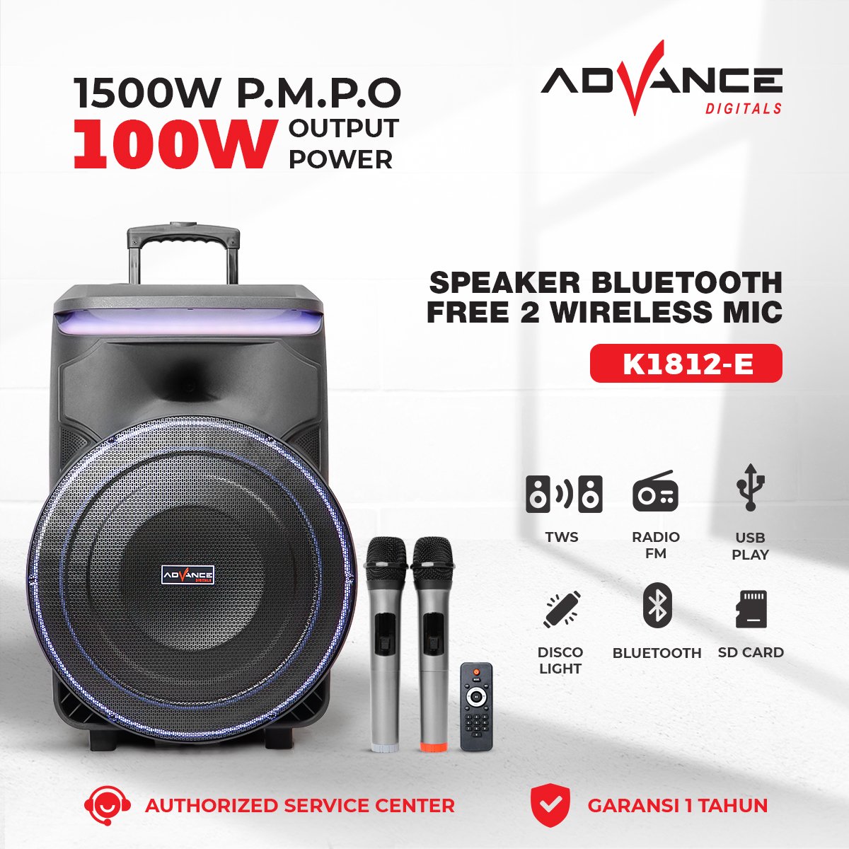 Nikmati pengalaman mendengarkan musik yang lebih seru dengan Advance Speaker Bluetooth K1812-E. Speaker portable ini dirancang dengan kualitas suara yang jernih dan bass yang kuat sehingga cocok digunakan untuk mendengarkan musik, menonton film, atau menemani aktivitas sehari-hari.