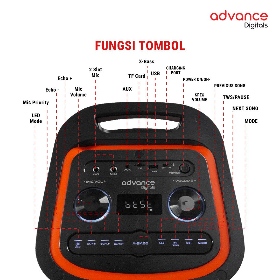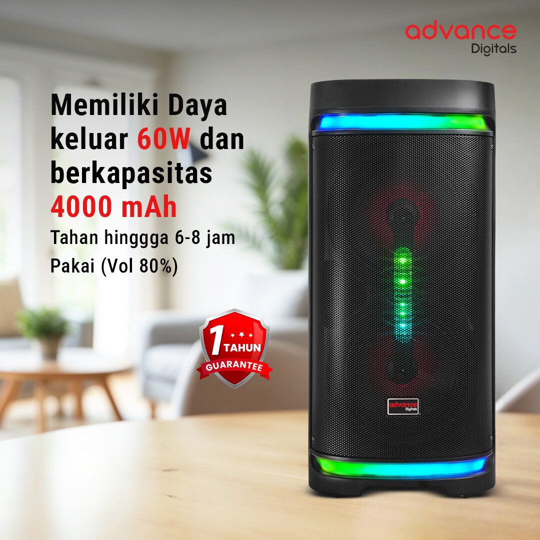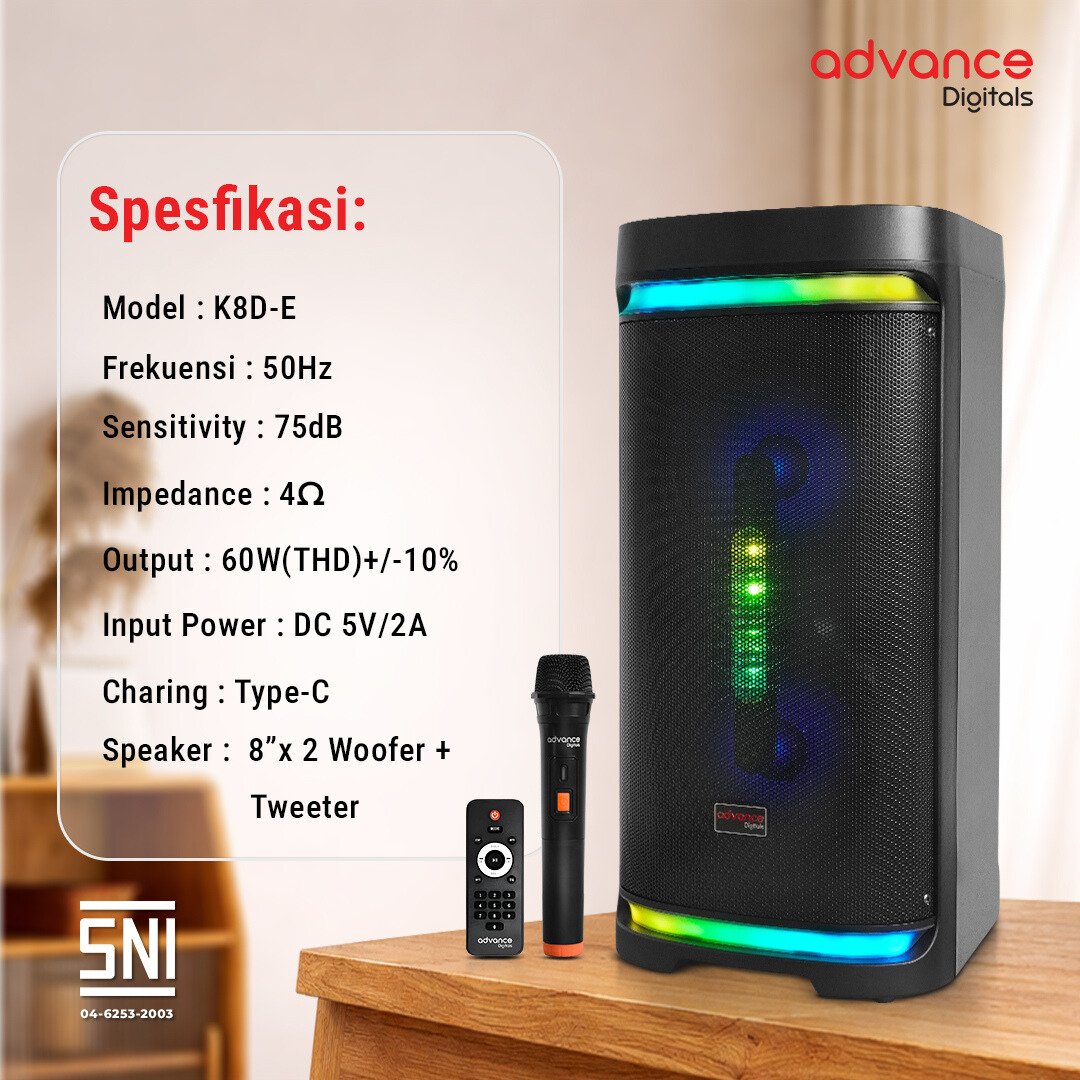 Dilengkapi dengan baterai rechargeable, Advance K8D-E memungkinkan Anda menikmati musik lebih lama tanpa perlu terhubung langsung dengan listrik. Desainnya yang portable membuat speaker ini mudah dibawa ke mana saja, cocok untuk menemani aktivitas santai, gathering, atau perjalanan.