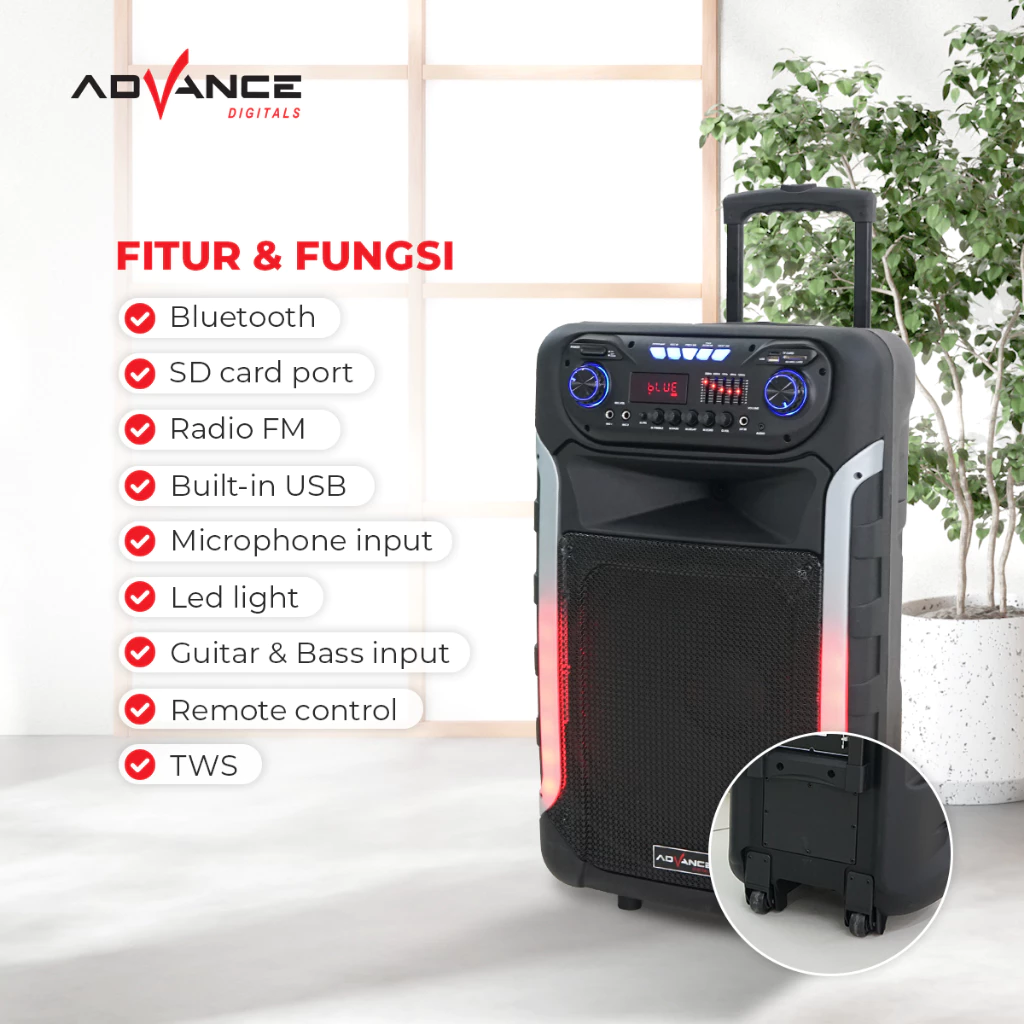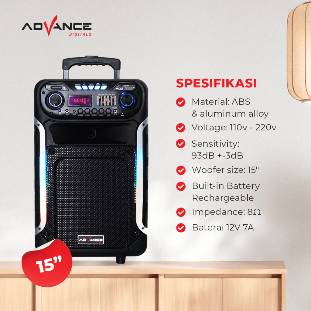 Advance K1512E adalah Speaker Meeting yang berukuran 15 inch Woofer + Tweeter, dengan design yang compact. Speaker ini dilengkapi 2 Microphone, port guitar in serta memiliki lampu RGB. Pada bagian atas speaker Advance K1512E ini terdapat pegangan tangan seperti tas koper dan dilengkapi dengan roda , sehingga speaker ini dapat kita pindah pindah dengan gampang dan mudah .